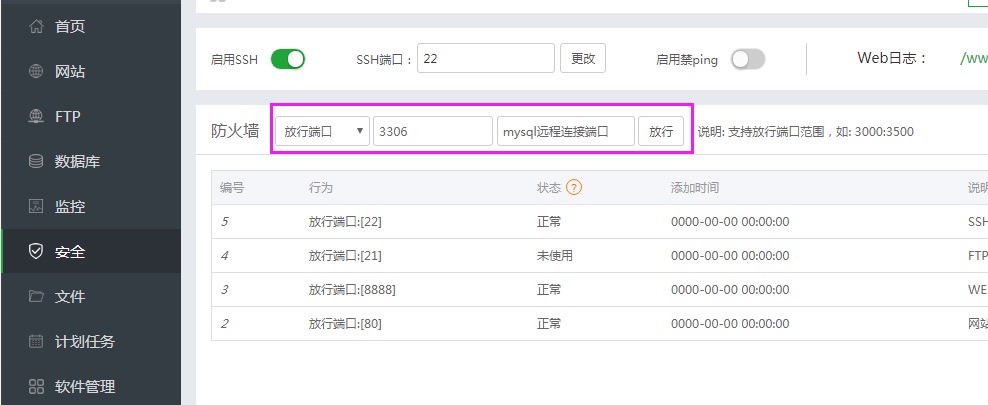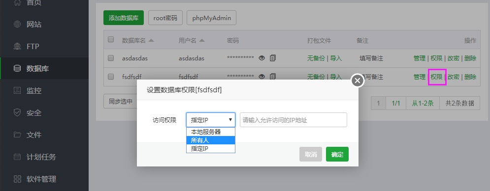 在宝塔面板中如果要开放数据库远程访问只需要做两步。